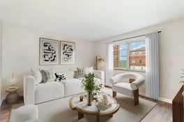 These select units feature a pass-through kitchen with a butcher block counter opening to the dining room, creating a connected, functional layout. These apartments are more extensively updated than standard units and may include upgraded finishes such as stainless appliances and enhanced tile. Finishes vary by unit.