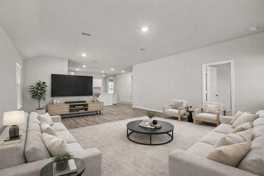 The beautiful Huntsville floor plan, Elevation C, offers an estimated winter completion and thoughtfully designed single-story living. This 4-bedroom, 2-bath home features approximately 2,000+ square feet of open-concept living space. The welcoming foyer leads past two secondary bedrooms and a spacious shared secondary bathroom. A separate hallway off the entry provides access to the utility room and a fourth bedroom ideal for guests, a home office, or flex space. The heart of the home showcases a bright, open living room, dining area, and gourmet kitchen. The kitchen is appointed with granite countertops, stainless steel appliances, gas range, large center island, and corner walk-in pantry, perfect for everyday living and entertaining. Enjoy outdoor living on the covered patio located just off the dining area. The private primary suite offers a relaxing retreat with a large walk-in closet, separate water closet, and oversized walk-in shower with ceramic tile surround. Additional highlights include a tankless water heater, ceramic tile flooring in the entry, hallways (per plan), kitchen, breakfast area, utility room, and bathrooms, plus full yard sod, professional landscaping, and irrigation system. This home also includes the HOME IS CONNECTED smart home package, allowing you to control lighting, thermostat, and door locks from your smartphone using a centralized hub. Future community amenities are planned to include a clubhouse, resort-style pool, splash pad, playground, dog park, fishing pond, pickleball courts, sand volleyball, and scenic walking and nature trails. Conveniently located near Highway 114 and Highway 287, Lonestar at Liberty Trails offers easy access for commuting, shopping, dining, and entertainment.