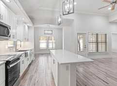 This stunning, newly constructed 3-bedroom, one-level Craftsman-style home is located in the charming community of Grande Oaks in the heart of Freeport. Nestled on a quiet cul-de-sac and surrounded by mature trees and lush foliage, the home offers privacy while providing easy access to Four Mile Creek, Choctawhatchee Bay, and is just 15–20 minutes from the Beaches of South Walton and the Gulf of Mexico. The exterior features beautiful curb appeal with Hardiboard and shaker-style siding accented by contrasting black gutters, a one-car garage, and a long driveway for ample parking. Inside, a welcoming entry leads to an open floor plan with porcelain flooring throughout, soaring 10–11 foot ceilings, and clean, contemporary trim and baseboards that create a bright and spacious feel. The kitchen exudes elegance with Quartz countertops, a farm sink, stainless steel appliances, soft-close cabinetry, a unique backsplash, and a Quartz breakfast bar with a tile accent underneath, flowing seamlessly into the dining area through an open archway. Stylish LED lighting is featured throughout the home. The spacious primary suite offers abundant natural light, three closets, and a stunning ensuite bathroom with a Quartz double vanity and a beautifully tiled shower with pebble flooring and a glass surround. Two additional bedrooms share a guest bathroom with a Quartz vanity and a tiled shower/tub combination with a deep soaking tub and glass surround. Additional highlights include custom shelving in closets and the walk-in pantry, a well-sized laundry room with upper cabinetry and a full-size washer and dryer, and a finished garage with sealed flooring, insulated garage door, and custom wood walls. The covered back patio is perfect for relaxing or outdoor dining, and the fenced backyard provides a peaceful and private setting. A 12-month lease is required, the renter is responsible for utilities, no smoking is allowed, pets are permitted, and for more information or to schedule a showing, please call 850-716-1712.