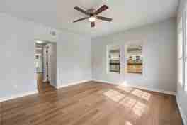 Updated unit with an open-concept layout and wood-look flooring throughout the main living areas. The modern kitchen features white shaker cabinetry, quartz-style countertops, stainless steel appliances, and a classic subway tile backsplash. Bright living and dining spaces are enhanced by contemporary lighting, neutral finishes, and a functional, low-maintenance design. Located in the 77009 area with a clean, modern interior throughout.