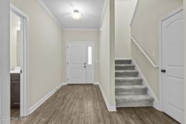 Welcome to this beautifully designed two-story home offering a modern open-concept layout and plenty of space to live and entertain. The main level features durable vinyl flooring throughout, high ceilings, and a spacious living area that flows seamlessly into the kitchen. The kitchen is equipped with a large island, ample cabinet space, and a pantry-perfect for cooking and gathering. A convenient half bathroom is located downstairs, along with a utility area and coat closet for added storage. Upstairs, you'll find a thoughtfully laid-out living space with the laundry room conveniently located on the second floor. All bedrooms are carpeted for comfort. The primary suite is a true retreat, featuring tray ceilings, high ceilings, and two walk-in closets for exceptional storage. Additional highlights include a two-car garage and a functional layout designed for both comfort and convenience. This home combines style, space, and practicality-an excellent place to call home.