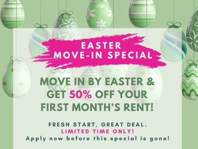 MOVE IN BY EASTER & GET 50% OFF YOUR FIRST MONTH’S RENT!