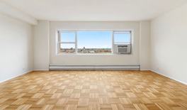 High floor, 1-bedroom apartment is move-in ready with refinished hardwood floors and freshly painted! The large L-shaped living room and dining area is bathed in sunlight from a wall of windows which look out onto an expansive skyline view! near restaurants, shopping, schools, parks and several modes of transportation. Fordham Hill Oval is a bucolic, 12-acre landscaped, gated community with 24-hour security with video surveillance,Buses: #12, 12-SBS, 10, Express Bus; Trains: #4, MetroNorth