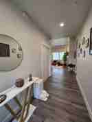 Two secondary bedrooms are located off the kitchen, offering separation from the primary suite. Both bedrooms overlook the front of the home—one featuring a walk-in closet and the other an accent wall for added personality. The nearby full bathroom is a well-appointed shared space with tile flooring, a large vanity, ample counter space, and a full tub/shower combination, all finished with coordinating cabinetry and countertops that match the rest of the home.