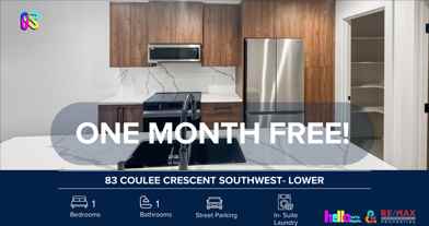 AMAZING 1 BED, 1 BATHS LOWER SUITE | NO PETS ALLOWED | ONE MONTH FREE FOR MOVE-IN BY MAR 1/26Welcome to your next home! This beautifully maintained 83 Coulee Crescent Southwest- Lower offers the perfect blend of comfort, style, and convenience in the community of Cougar RidgeSHOWINGS: Open-house format — book today! https showmojo com listings 8a80cdc0e5 Prices, availability, and promotions subject to change without notice.Features: - Furnished or Unfurnished: Unfurnished - Pets: No Pets Allowed - Smoking: Non-Smoking - Parking: Street Parking - Storage Included: No - Laundry: In- Suite Laundry - Management Type: Full Management - Lease Term: Long TermWhy You'll Love It: - Kitchen/Dining: Includes a designated layout for a full kitchen (including pantry space) and a dining area. - Dedicated Laundry: Pre-plumbed and wired for its own independent laundry set, separate from the upper floors. - Ceiling Height: 9-foot ceilings (consistent with the main and upper floors) to ensure it doesn't feel like a typical basement. - Outdoor Access: Direct access to the fully fenced and landscaped backyard through the walk-out garden doors. Split Utilities Information: - Utilities Included: No Utilities Included - Shared Utility Unit: Utilities split between 2 units: 60% Main (Upper), 40% Secondary (Lower) - Deposit: $350 for Main, $225 for Secondary (first 3 months of tenancy).Location Perks: - Elite Private Schools: Walking distance to Calgary French & International School (CFIS) and minutes from Webber Academy and Rundle College. - Top Public Education: Within the catchment for highly ranked schools like West Springs School and Ernest Manning High School. - Mountain Gateway: Located on the far west edge of Calgary, allowing for a head start to Banff, Canmore, and Kananaskis in under an hour. - Modern Amenities: 5-minute drive to West 85th and Aspen Landing shopping hubs, featuring Mercato, Vin Room, and boutique fitness. - Winter Sports: Immediate proximity to WinSport (Canada Olympic Park) for skiing, snowboarding, and mountain biking. - Recreation Access: Close to Westside Recreation Centre, offering an aquatic park, ice rinks, and a massive fitness facility. - Commuter Friendly: Approximately a 16-minute drive to Downtown Calgary and quick access to the Stoney Trail ring road. - Natural Spaces: Steps from the Paskapoo Slopes, providing over 200 hectares of natural ravines and hiking/biking trails. - Public Transit: Near the 69th Street SW LRT Station, providing a direct train link to the city core. ONE MONTH FREE offer: A special savings equal to one month's rent (maximum), spread evenly across your 12 month lease. For leases with initial term less than 12 months, the incentive will be prorated accordingly. Book your viewing today — this one won't last.