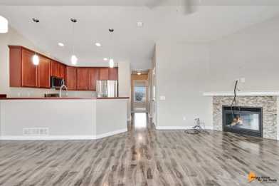 Open concept kitchen, living, and dining area is perfect for everyday living and entertaining, featuring a cozy fireplace and access to a private balcony. Spacious primary bedroom includes an en suite full bathroom.