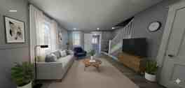 The interior showcases a contemporary grey color scheme throughout, complemented by pristine white trim and doors. The renovations have introduced recessed lighting, providing a bright and inviting atmosphere. The living areas boast elegant grey laminate flooring, while the bedrooms are fitted with plush carpeting for comfort.