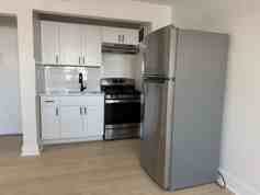 The unit features a modern kitchen fitted with an oven and refrigerator.
