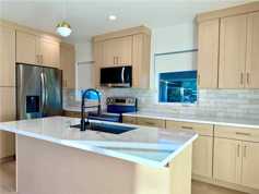 The open-concept first floor features a stunning chef’s kitchen with a large center island, light oak cabinetry, and brand-new appliances, all accented by classic subway tile and refined gold hardware. A stackable washer and dryer are seamlessly tucked behind custom barn doors, blending function with design. Also on the main level is a serene half bath with a built-in vanity and pendant lighting, along with warm wood flooring and generous living space perfect for both relaxing and entertaining.
