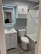 The updated bathroom features a new bathtub surround, ventilation fan, front- and backlit LED mirror, and a sleek storage cabinet. A high-efficiency water-saving toilet ensures both comfort and sustainability.