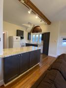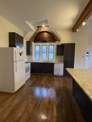 - Open-concept living and kitchen area with vaulted open beam ceilings, brick walls, and restored pine floors