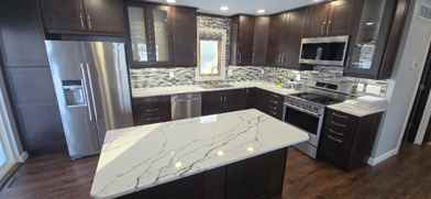 European-style kitchen cabinetry with quartz countertops and all-new Maytag stainless steel appliances, including gas range, dishwasher, and counter-depth refrigerator. Under-cabinet kitchen lighting.