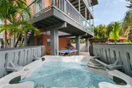 The ground level is designed for true island living with tandem parking for at least two vehicles plus room for a boat or trailer. Inside the fenced courtyard you’ll find a private outdoor retreat featuring a heated spa, ping-pong table, gazebo cabana, outdoor grill, and shaded lounge areas—a turnkey backyard made for year-round enjoyment.