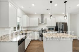 This two-story home offers 2,213 square feet with four bedrooms and three full baths, laid out in a smart open concept that makes everyday living and entertaining feel effortless. The great room connects the living area and kitchen in one seamless flow, highlighted by wood laminate flooring and recessed lighting.