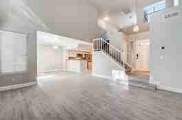 The family room, complete with a cozy fireplace, is perfect for entertaining or relaxing. The primary bedroom boasts a large walk-in closet, sitting window nook, and an en suite bathroom with dual sinks. The second bedroom includes an en suite bathroom and built-in shelving. The upstairs loft has plush carpeting, while luxury vinyl plank flooring enhances the main living areas. Washer and dryer conveniently located in the garage. A paved patio with plants in the backyard, and front yard desert landscaping for easy maintenance. As an extra added perk, Trash, Sewer and Tenant Portal Fee are included in rent!