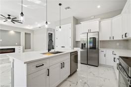 Be the first to live in this stunning brand-new 2025 construction rental in desirable NW Cape Coral. This 3-bedroom plus den, 2-bath home is perfectly situated on a quiet cul-de-sac with peaceful golf course views and no rear neighbors. Inside, enjoy tile flooring throughout, soaring ceilings, and an open-concept layout filled with natural light. The designer kitchen features quartz countertops, upgraded appliances, a chef's sink, tiled backsplash, pantry, and a wet bar with wine fridge-perfect for entertaining. The spacious primary suite offers dual vanities, a soaker tub, tiled walk-in shower with glass enclosure, and two walk-in closets. Additional highlights include a 3-car garage, paver driveway and lanai, hurricane-impact windows and doors, soffit and recessed lighting, electric fireplace with custom accent wall, tankless water heater, and in-residence laundry. The private den with glass doors is ideal for a home office or flex space. Located in a quiet, upscale neighborhood, this home truly checks all the boxes for comfort, style, and location. Schedule your private showing today.
