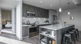 Wide-plank engineered hardwood floors in kitchen and living