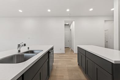 Single-story Perry Homes. Brick/stone elevation with covered entry. The foyer opens to an open-concept kitchen, dining, and family room. The kitchen includes a center island and a walk-in pantry. 4 bedrooms and 3 full baths. Rear primary suite with walk-in closet- primary bath with dual sinks and separate tub/shower. Secondary bedroom wing with shared bath. Utility room, covered patio, and 2-car attached garage.