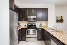 This spacious 1 Bedroom + Den, 2 Bathroom condo offers approximately 600–699 sq ft of thoughtfully designed space with 9-foot ceilings and a bright open-concept layout. The modern kitchen features granite countertops and stainless steel appliances, flowing seamlessly into the living and dining area — perfect for entertaining or relaxing.