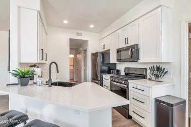 This beautifully remodeled, fully furnished 2 bedroom/2 bath upstairs condo is ideally located poolside within a gated community! Thoughtfully designed with modern furnishings and stylish finishes throughout, this turnkey home is ready for immediate enjoyment, whether you're relocating, seeking a seasonal retreat, or looking for a fully equipped home. The modern kitchen is fully stocked with dishware, cookware, utensils, coffee maker, toaster, and more. Enjoy relaxing in the open great room with a comfortable sofa and TV. A built-in desk nook perfect for work or study. The spacious primary suite features a king-size bed, walk-in closet, and balcony overlooking the pool. The guest bedroom offers a queen bed and a walk-in closet. Take advantage of the community's amazing amenities, including a heated pool, gas BBQ areas, fitness center, and office/conference spaces. Located within walking distance to a local shopping center and just minutes from golf courses, top-rated restaurants, shops, and scenic hiking trails. This home truly offers the best of location and lifestyle!