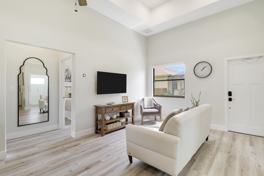 Discover tranquility and contemporary comfort at this stunning, newly built guest house, ideally situated in a serene and quiet location perfect for your Polo Season stay. Impeccably constructed and thoughtfully designed, this inviting residence features 2 comfortable bedrooms, each with a queen size bed, one offering a full closet and the other equipped with an armoire closet. Enjoy luxurious touches throughout, including 14 foot ceilings with stylish 12 inch soffits, sleek quartz countertops, and high end stainless steel appliances. Convenience is key with thoughtful details like soft close cabinetry, pull out drawers, an in unit washer and dryer, and a contemporary walk in shower. Relax comfortably in the living space furnished with a plush couch and chair, or enjoy entertainment on