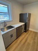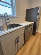 Thoughtfully renovated apartment, blends the industrial style with preserved historic details. Features a clean, contemporary palette of modern whites and soft grays, complemented by light oak floors throughout. Original craftsmanship shines through arched openings, original wooden doors, and detailed trim, adding depth and character. Industrial-inspired finishes, and large windows and open layout provide abundant natural light. The layout offers comfortable separation of spaces, including a dedicated dining room, ideal for entertaining or working from home, an updated kitchen with gray cabinetry, fully equipped with dishwasher, microwave, and gas stove, and a bathroom that retains its original tile elevated by tasteful upgrades.