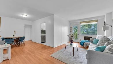 The contemporary galley kitchen has been tastefully renovated with stainless steel appliances, quartz countertops, ceramic hex-tile flooring, and custom cabinetry. A generous dining area seamlessly adjoins the kitchen, ideal for relaxed meals and entertaining.