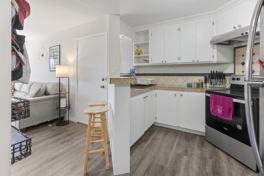 The kitchen features stainless steel appliances, clean white cabinetry, and a breakfast bar that flows seamlessly into the living area, creating a comfortable space for everyday living or entertaining. Large windows enhance the airy feel of the home while maintaining privacy within the community.