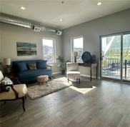 Unit with abundant natural light and a juliet balcony featuring sliding doors. Enjoy stunning west-facing views of downtown from the open concept kitchen and living room, which boast elegant grayish brown hardwood floors. The modern kitchen is equipped with white cabinets, black and grey countertops, and high-end KitchenAid appliances.