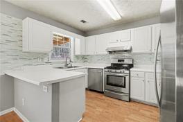 The main level welcomes you with a spacious foyer that opens to a formal dining room with an elegant chandelier -- ideal for evening gatherings. The generous living room features a marble-surround fireplace, perfect for relaxing on cooler evenings, and connects seamlessly to the kitchen and breakfast nook. The kitchen showcases white cabinetry, sleek stainless steel appliances including a gas range and French-door refrigerator, stylish glass tile backsplash, and white countertops with a convenient peninsula for casual dining.
