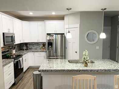The perfect home for upscale living! Located in the sought-after Eagle Mountain community and in a quiet neighborhood. This lovely, modern townhome is move-in ready. The home is bright, spacious, and full of upgrades. Enjoy smooth gray paint throughout, beautifully designed contemporary doors, modern casing, and high-end tile in the bathrooms. The main floor features 9-foot ceilings, wood laminate flooring, canned lights, mud area with storage at the back door, and a half bath. Enjoy an open-concept kitchen, dining, and living area. The kitchen is a chef's dream with an abundance of light, lovely quartz countertops, a large island with bar seating, a roomy pantry, modern backsplash, white solid wood cabinetry, and a deep basin sink. The living room, stairs, and upper floor have high-quality, neutral carpet. Upstairs features wide hallways and an inviting, generously sized primary bedroom with an en suite and large walk-in closet. En suite has beautiful custom tiling throughout, a double vanity, a deep soaking tub and shower, vanity makeup lights, and plenty of storage. Two additional upstairs bedrooms each have a walk-in, deep storage closet. There is also a secondary full bath with custom tiling and a laundry room upstairs. The garage holds two cars and has a man-door access. There is an unfinished basement for storage, including a large cold storage room. Enjoy a large, clean park in the front yard with two playgrounds, huge field, and a convenient walking trail. Quiet neighborhood 2 minutes from Eagle Valley Elementary, 4 minutes from Macey's, and 6 minutes from Cedar Valley High School. Tons of business are also about to open up near Macey's. Inclusions: microwave, dishwasher, smart thermostat, tv wall mounts, and water softener. Full house, basement and garage lease. Perfect for families. One year term, then optional month to month as agreed to by all parties. All utilities are separate and the tenants will be expected to pay for them. Lease will start May 1st, 2026 where possible. No smoking or drugs allowed. No illegal activities. Optional pet rent. Mature/potty trained pets only. If tenant has a pet, there will be a $700 nonrefundable pet deposit and $75/pet per month additional charge. Up to a 2 pet maximum. Full contract will be signed before lease begins. Ask about other details. Must fill out an online application and pay the fee for a background check and credit check. Must prove steady income of at least 2x rent. Also, clean eviction and criminal record. All qualified applicants will be considered. It is up to landlord's full discretion which applicant will be accepted. Security deposit is due by the first day of of the leasing period. $400 of the security deposit will be nonrefundable. For questions on other fees such as late fees, damages, etc. see the full contract.