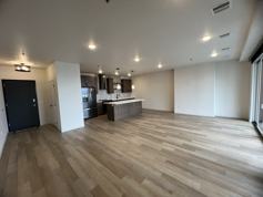 This beautiful One-Bedroom, One and a half Bathroom condo offers stunning city views and a private balcony. The chef's kitchen features custom cabinets, fingerprint-resistant appliances, and quartz countertops. The spacious bedroom includes a large walk-in closet, while the primary bathroom boasts a walk-in shower and dual-sink vanity with ample storage. The building provides a range of amenities, including a fitness center, community room, heated underground parking, a self wash car bay, and elevators all within a secure, well-maintained environment.