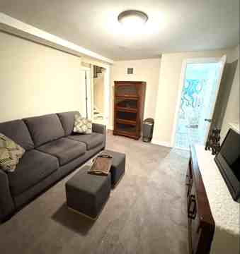 Beautiful 1-bedroom apartment featuring a living room and kitchen equipped with microwave, air fryer, and refrigerator.