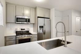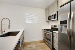 The updated kitchen features a sleek stainless steel appliance package—including a dishwasher, stove, refrigerator, and microwave—plus the added convenience of an in-unit washer and dryer.