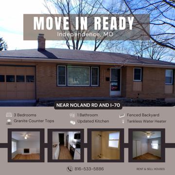 Charming 3 bedrooms and 1 bath brick ranch located on E Erickson Rd in Independence, conveniently near Noland Rd and I-70. This home features beautiful hardwood flooring and an updated open-concept kitchen designed for entertaining. The kitchen offers abundant cabinet space, granite countertops, and all new stainless steel appliances including STOVE, REFRIGERATOR, MICROWAVE, and DISHWASHER. Additional features include a single-car attached garage, unfinished basement, tankless water heater, central heating & Ac, washer/dryer hookups, and a large fenced backyard perfect for outdoor enjoyment. A solid brick exterior and classic ranch layout provide both charm and functionality.