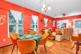 Fully furnished living room, dining room and kitchen