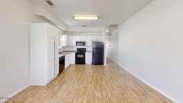 Tile/wood flooring in living room/kitchen.