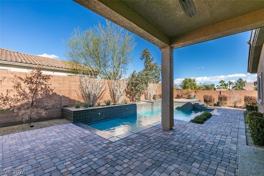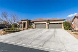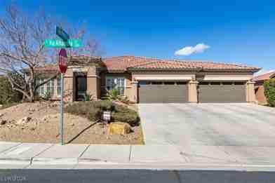 Stunning home located on a desirable corner lot within a gated community, featuring a spacious four-car garage with epoxy flooring and built-in cabinets, and a large, beautifully landscaped lot with lush greenery and mature fruit trees. Enjoy outdoor living with a heated pool and serene surroundings. Inside, the home boasts high ceilings, an open-concept kitchen equipped with Monogram appliances, including a stove, microwave, and double ovens, and a separate dining room complete with a built-in bar and wine fridge—perfect for entertaining. The thoughtfully designed layout offers three bedrooms plus a den/office, three bathrooms, custom closets, plantation shutters throughout, and a separate laundry room with a sink. Finished with elegant two-tone paint, this exceptional property combines comfort, style, and functionality. Ideally located near Raiders Stadium, the airport, shopping, and dining, this home offers both luxury and convenience.