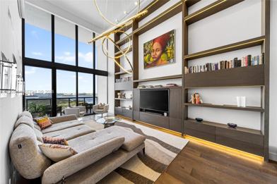 A rare two-story PH in Miami’s highly sought-after Edgewater neighborhood. This expansive 2-bedroom, 2.5-bath residence offers over 2,000 square feet of living space, soaring 22-foot ceilings, abundant natural light, and unobstructed Biscayne Bay views. A unique floor plan—unlike any other in the building—provides exceptional scale and privacy with just one shared wall. Open-concept living and dining areas flow to a private balcony, ideal for seamless indoor-outdoor entertaining. Custom built-ins, a sleek bar with a Subzero wine refrigerator and dedicated ice maker, a designer kitchen featuring Miele appliances, Poliform cabinetry, and a marble waterfall island elevate the space. With one bedroom on each level, separate A/C zones, and a primary suite with a walk-in closet and dedicated office overlooking the bay, the layout offers both comfort and flexibility. The second bedroom has its own ensuite bath. Residents enjoy resort-style amenities including a fitness center, sauna, steam room, two pools, business center, children’s play area, and on-site market. Includes 3 parking spaces (2 assigned and 1 valet). Ideally located near the Beaches, Midtown, the Design District, and the new Whole Foods.