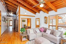 Inside, you will find wood beam ceilings with skylights, a wood burning stove, and an open floor plan designed for comfort and flexibility. Additional spaces include a den or office that can function as a third bedroom, a loft, mud room or atrium entry, kitchen island, and a bonus room above the one car garage. There is also a small basement for extra storage.