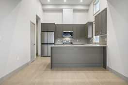 - Concrete-inspired laminate counters in the kitchen and bathroom