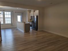 The main level features a bright and spacious layout with wide-plank flooring, crown molding, and abundant natural light. The living area flows seamlessly into a stylish kitchen equipped with white cabinetry, granite countertops, stainless steel appliances, gas range, tile backsplash, and a large island with bar seating — perfect for everyday living and entertaining.