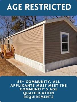 PLEASE NOTE: This home is located in a 55+ age-restricted community. Age requirements apply and must be met per community guidelines. 2022 3 Bed / 2 Bath Rental - Move-In Ready! Beautiful 2022 mobile home now available for rent! This 3 bedroom, 2 bathroom home offers a modern open layout, spacious living area, and a well-designed kitchen with plenty of cabinet space. The primary bedroom features a private bathroom, and the split floor plan provides added privacy. Clean, well-maintained, and move-in ready. This is a 55+ community. All applicants must meet the community's age qualification requirements. Contact us today for more details or to schedule a tour!