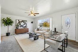 Spacious Living Area: Large picture windows and a modern ceiling fan.