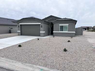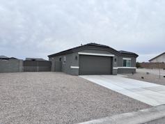 Step inside to an open-concept layout featuring wood-look tile flooring, recessed lighting, and a spacious living area that flows seamlessly into the kitchen. The kitchen is beautifully appointed with granite countertops, dark cabinetry, stainless steel appliances, subway tile backsplash, and a large island with sink — perfect for everyday living or entertaining. The primary suite offers privacy and comfort, while three additional bedrooms provide flexibility for guests, a home office, or growing households. You'll appreciate the indoor laundry room, attached 2-car garage, with the added benefit of solar panels—helping you enjoy significantly lower electricity bills, especially during those warm Arizona summers. The backyard is fully fenced with a block wall for added privacy and security and low-maintenance landscaping. Located in Sage Hill with no HOA, this brand new home is move-in ready and offers modern style without the added restrictions.
