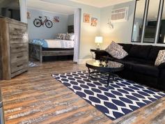 Located in our sweet little private neighborhood at Ritchie Village, this one-bedroom has a fun bicycle theme that runs through the small, freshly-designed place. From gear-edged coasters to coffee and end tables with built in bike spokes, travelers will delight in the details.