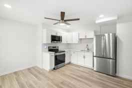 Completely rebuilt 2 bed / 1 bath apartment offering modern style and efficient living. This ground-floor unit is slightly smaller than the others but offers the same brand-new construction quality and high-end finishes, giving renters the opportunity to enjoy a modern 2-bedroom home in a newly rebuilt building at a more accessible price point. Everything here is new, including the electric, plumbing, HVAC, impact windows, insulation, and premium finishes throughout. The kitchen is beautifully designed with new cabinetry, quartz countertops, stainless appliances, and brand-new in-unit laundry for added convenience. The bathroom features gold fixtures and a stylish tub-shower combo—ideal for those who prefer a full bath. With commercial-grade building systems and a quiet setting, this unit delivers reliable, low-maintenance living close to Downtown St. Pete and Crescent Lake Park, complete with secure on-site bike parking for riders.