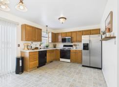The kitchen features raised-panel cabinetry with a built-in microwave and comes fully equipped with a stove, refrigerator, and dishwasher. Enjoy year-round comfort with central air conditioning, along with the convenience of an in-unit washer and dryer. Step outside to a rear deck, ideal for relaxing or entertaining. This townhome is part of an HOA community, offering a well-kept environment.