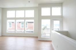 The upper level features a spacious vaulted great room with large windows and an open-concept kitchen, living, and dining area. The kitchen includes stainless steel Samsung appliances and contemporary finishes. The primary suite offers a full private bathroom and walk-in closet, plus a convenient half bath for guests on the same level. Step onto the balcony to enjoy Mt. Hood views and morning sun.