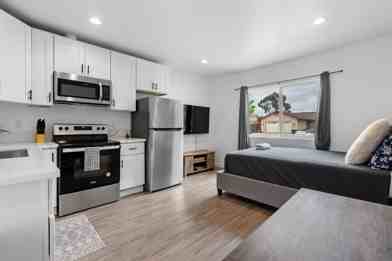 Modern, updated studio with fast WiFi, WFH desk, Air Conditioning, and cozy comfortable bed. 31 day minimum, all utilities and cooking utensils included. Attached to another home, but properly sound-proofed and has a private entrance. Pet friendly, for a $100 fee. Street parking is easy and plentiful.